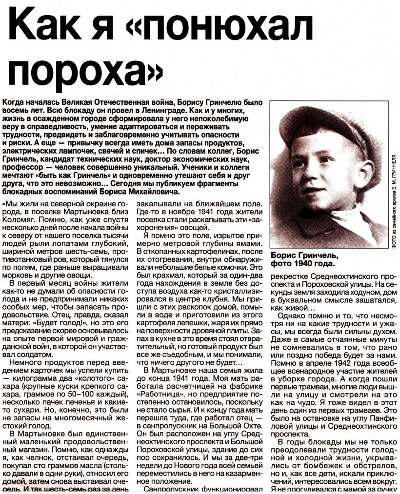 Он пережил всю Блокаду Ленинграда в городе, воспоминаниями о которой он и поделился в опубликованной статье. ИПРЭ РАН гордится тем, что с нами работал и продолжает сотрудничать такой замечательный ученый как Гринчель Б.М