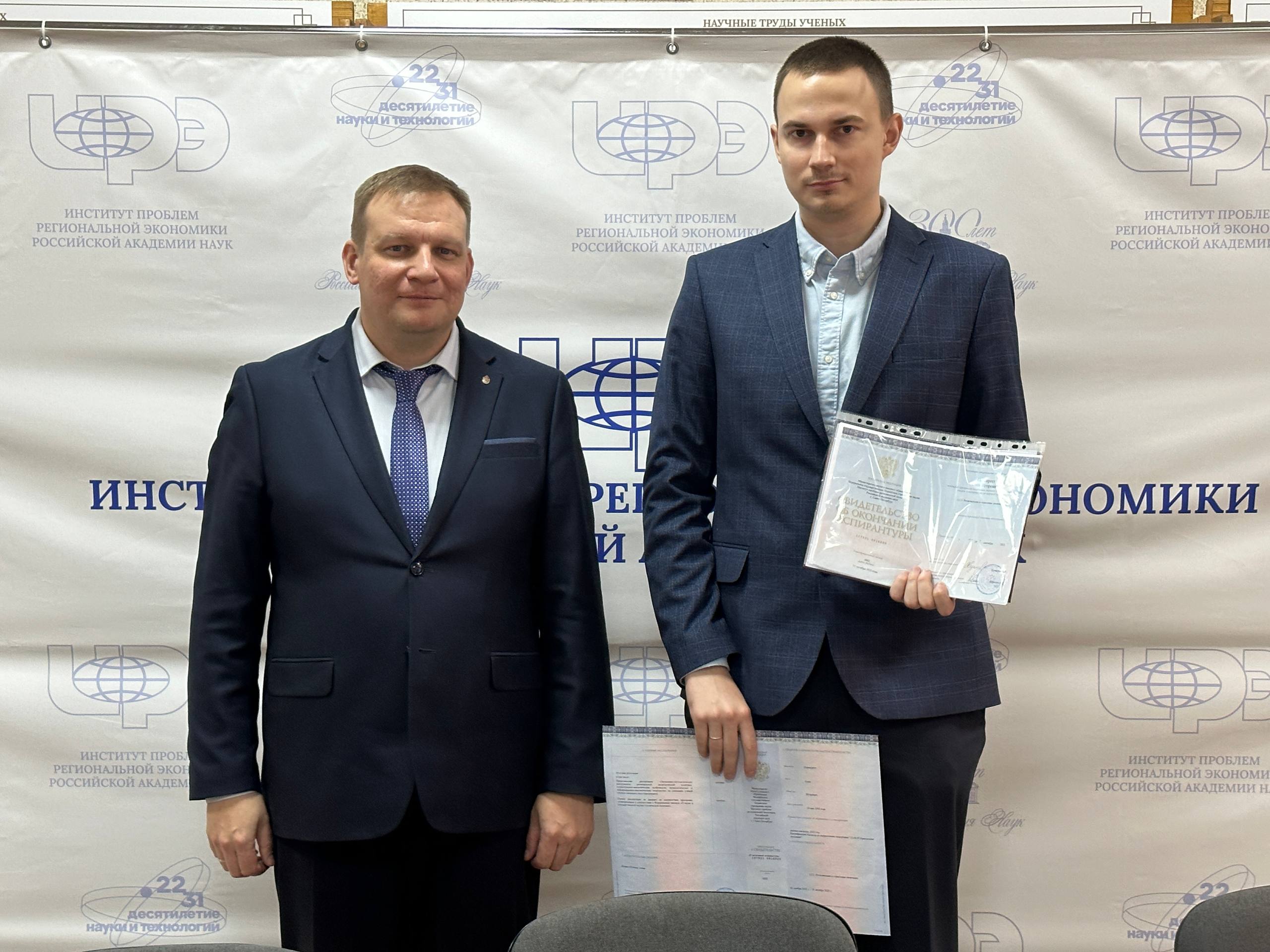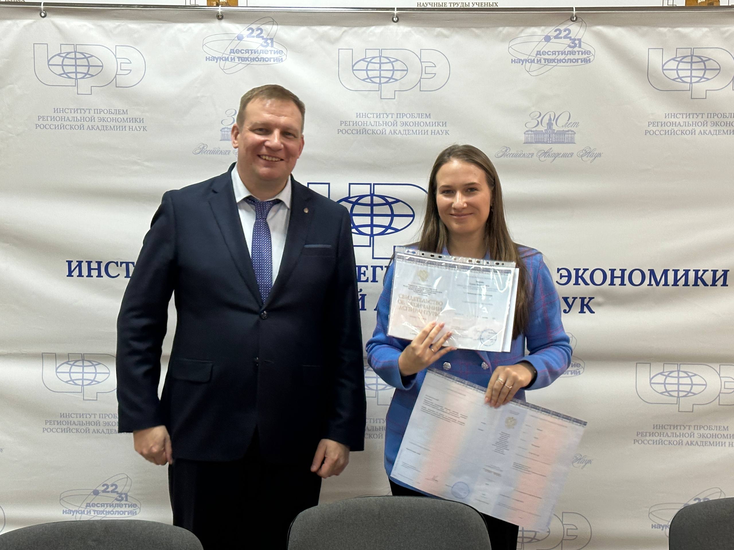 12 ноября 2025 года во время III международной научно-практической конференции «Структурная трансформация экономики Арктических регионов» состоялось торжественное вручение свидетельств об окончании аспирантуры аспирантам ИПРЭ РАН 2025 года выпуска Зверевой Елене Викторовне и Перекресту Олегу Игоревичу.