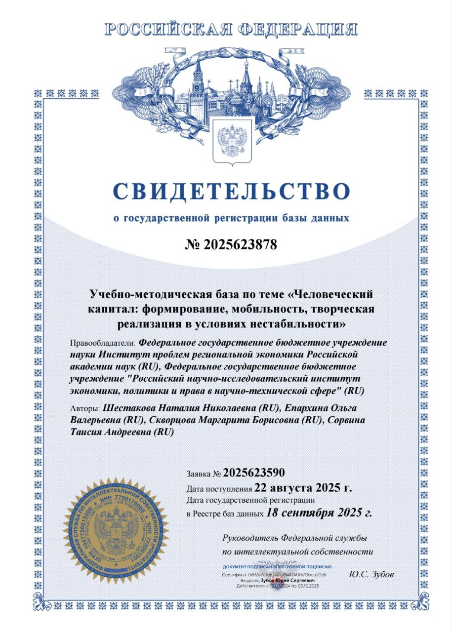 Правообладатель: ФГБУН Институт проблем региональной экономики Российской академии наук, ФГБУ «Российский научно-исследовательский институт экономики, политики и права в научно-технической сфере».
