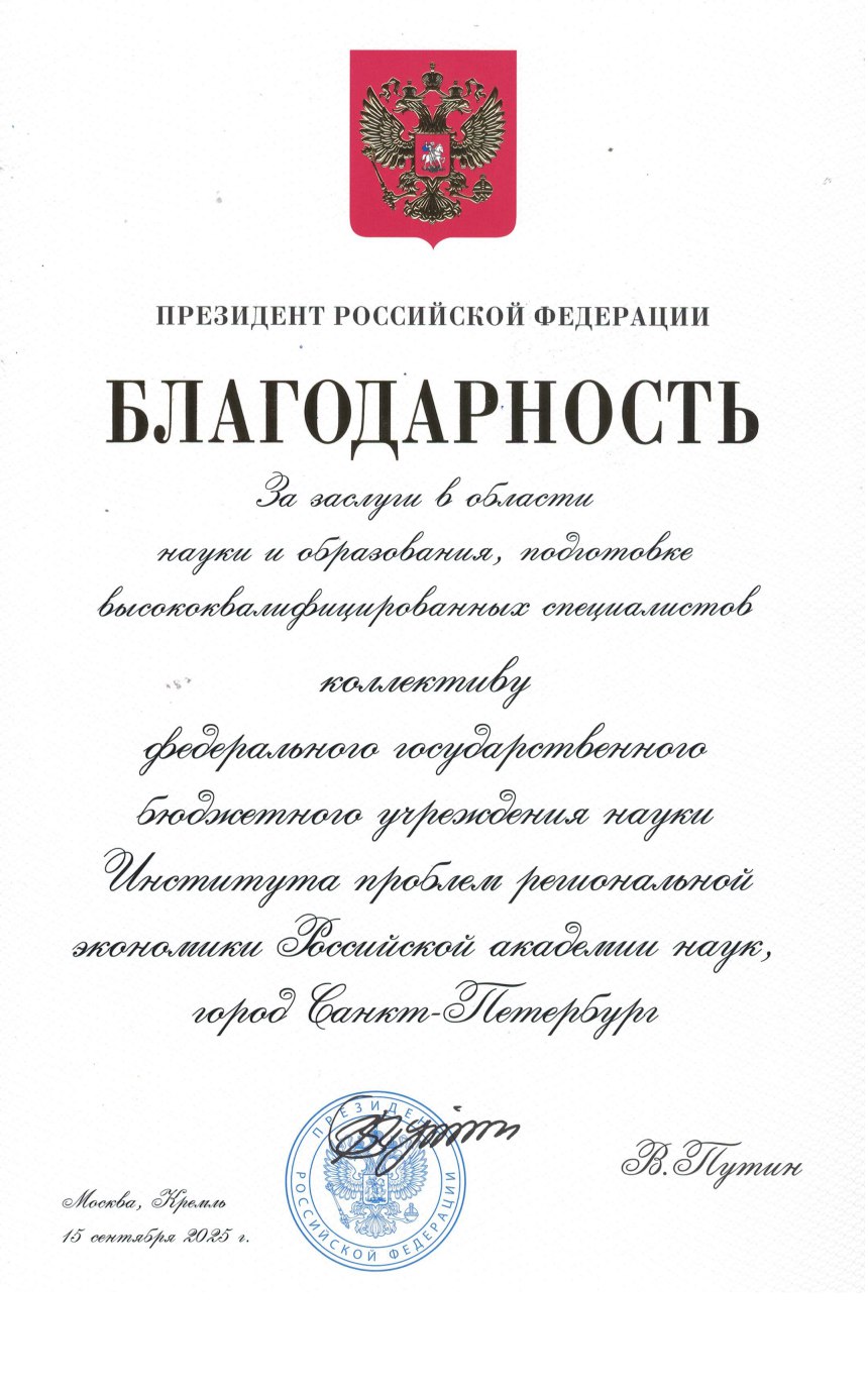Коллектив Института проблем региональной экономики РАН удостоен Благодарности Президента Российской Федерации Владимира Владимировича Путина за заслуги в области науки и образования, подготовки высококвалифицированных специалистов