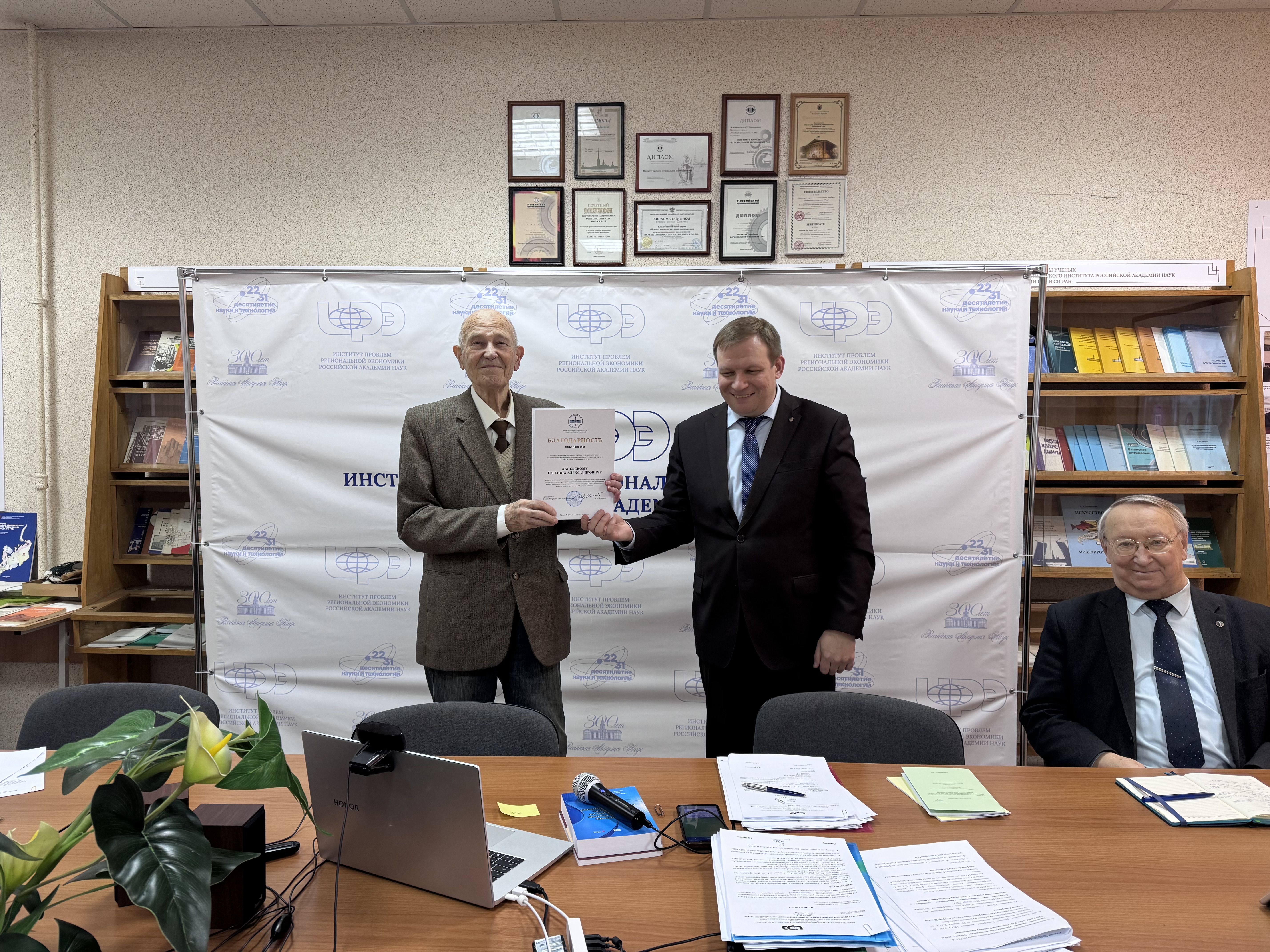 24 декабря 2024 на заседании Ученого совета ИПРЭ РАН состоялось вручение благодарности Санкт-Петербургского отделения Российской академии наук ведущему научному сотруднику Лаборатории математического моделирования функционально-пространственного развития городов ИПРЭ РАН, кандидату технических наук Каневскому Евгению Александровичу за достигнутые научные результаты по разработке методов математической лингвистики и программных систем для автоматического построения баз знаний о социально-экономических процессах путем формализованного анализа текстов и в связи с 90-летним юбилеем.