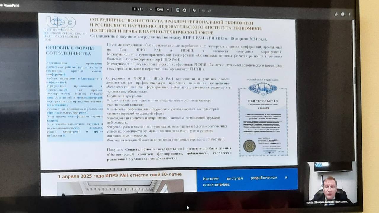 Название доклада, представленного А.Д. Шматко: «Результаты исследования ИПРЭ РАН в области кадрового обеспечения научно-технологического развития в Северо-Западном федеральном округе РФ». В рамках своего выступления Алексей Дмитриевич изложил результаты исследований, реализуемых научными структурными подразделениями Института под руководством научного руководителя ИПРЭ РАН, д.э.н., профессора, академика РАН Окрепилова В.В. в соответствии с решениями Ученого Совета ИПРЭ РАН, подробно рассказал о результатах сотрудничества ИПРЭ РАН и РИЭПП (Соглашение о научном сотрудничестве от 18 апреля 2024 года), к числу которых относится: проведение совместных мероприятий; реализация программ дополнительного профессионального образования; получение свидетельства государственной регистрации базы данных «Человеческий капитал: формирование, мобильность, творческая реализация в условиях нестабильности».