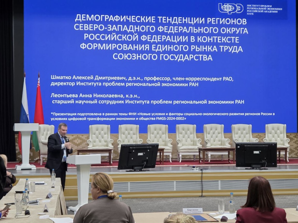 В рамках секционного заседания Алексей Дмитриевич представил доклад на тему «Демографические тенденции регионов Северо-Западного федерального округа РФ в контексте формирования единого рынка труда Союзного государства», подготовленный совместно с Леонтьевой Анной Николаевной, к.э.н. старшим научным сотрудником ИПРЭ РАН.