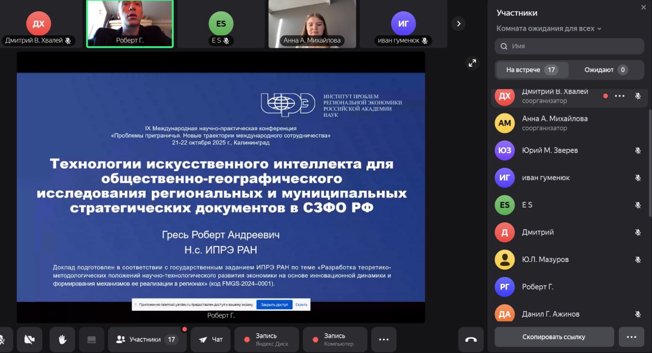 В рамках секции конференции "Социально-экономическое и инновационное развитие приграничных регионов" н.с. ИПРЭ РАН Р.А. Гресь представил доклад на тему: